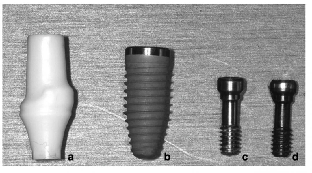 圖5 Components of the implant-abutment-screw system: (a)zirconia abutment, (b) implant fixture,(c)aftermarket abutment screw, and (d)OEM abutment screw.