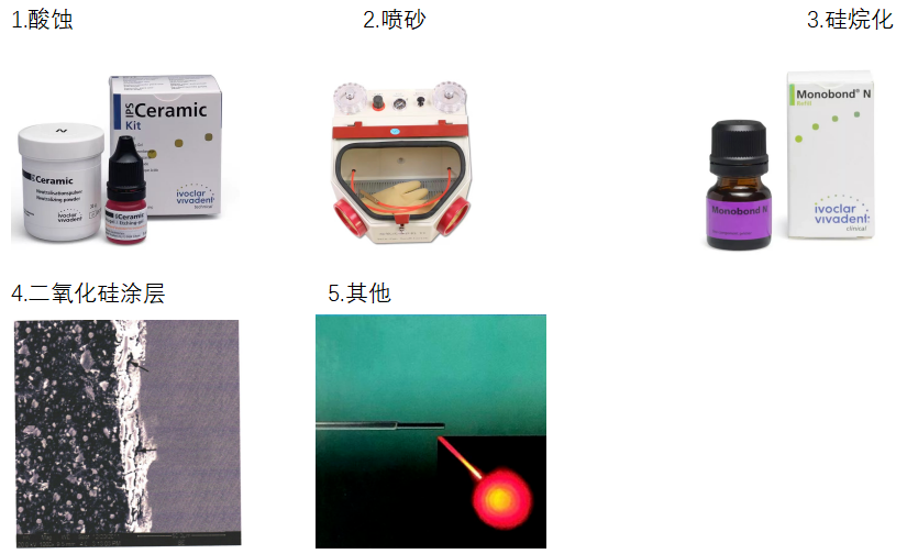 陶瓷表面處理可提高與樹脂之間的粘接力,常見的陶瓷表面處理主要分為機械方法及化學方法。總體來看,噴砂、蝕刻技術和硅烷偶聯劑是最常見的方法,但由于氧化鋯陶瓷為多晶陶瓷,不含玻璃基質,酸蝕作用有限,學者們通過改變氧化鋯表面粗糙度、成分等來改善其機械鎖合及化學粘接性能。
